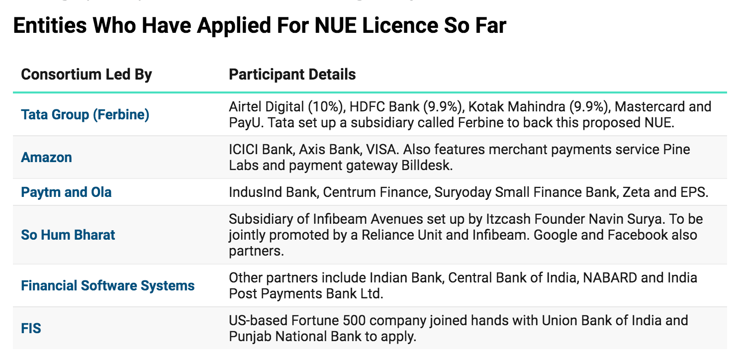 Last year, the RBI issued guidelines for possible new umbrella entities - NUE(s) - that would be allowed to set up and operate payment systems manage payment systems and compete with the NPCI.