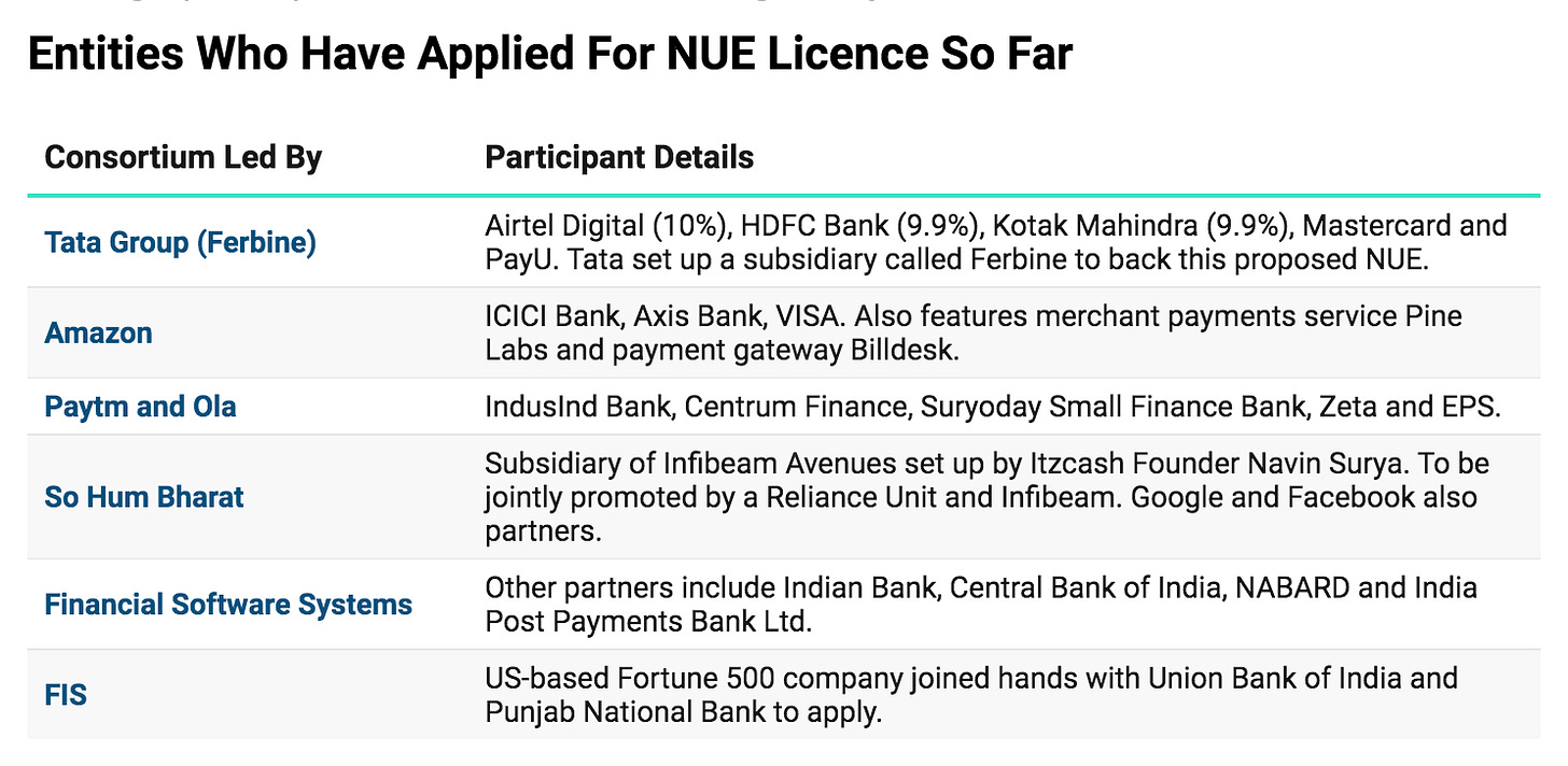 So far six entities have applied for a NUE license (source: Transfin). A lot of the names on the list should not be a surprise. Players like Amazon and Reliance clearly want a share of the growing digital transactions pie, and this ties in nicely with the e-commerce aspirations. The same goes with the other financial institution players who were clearly caught off-guard by UPI's success.