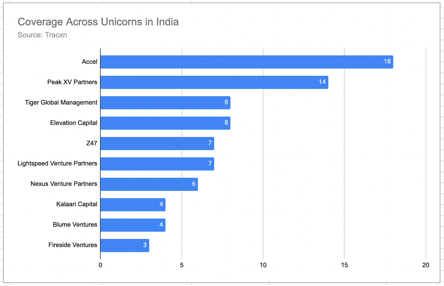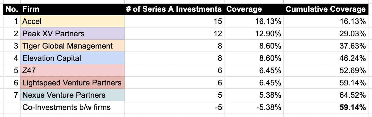 The answer was, unsurprisingly, very important. Just 7 firms led the Series A of ~60% of startups that are worth $1B+ today. The list of firms is just as predictable - Accel, Peak XV Partners, Tiger Global Management, Elevation Capital, Z47 (fka Matrix Partners India), Lightspeed India Partners and Nexus Venture Partners.