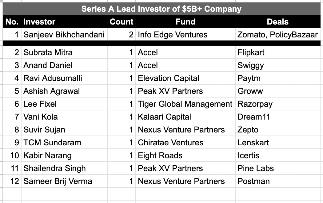 A partner at a global growth firm in the US once asked me - “which individual investors in India would be considered world class even in America?”. This was an individual who had invested in growth-stage companies in the country and was very familiar with the landscape and the people, and I was not familiar with most of the partners personally so never had a great answer for them. Now I can at least attempt to answer that question by seeing what individuals led the Series A for Indian companies worth $5B+ or more (to compare to this list).