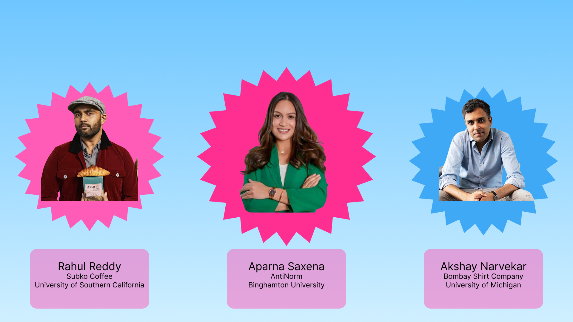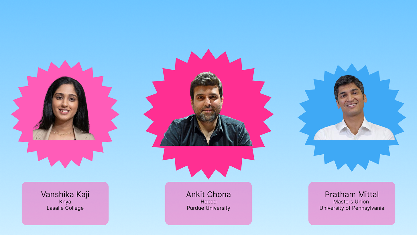 Harsh Jain (Dream11 x UPenn) single-handedly created a fantasy sports ecosystem in the country by having faith that the market would eventually be ready for such a product. Aadit Palicha and Kaivalya Vohra (Zepto x Stanford) showed consumers that you can build an ecommerce marketplace from scratch and deliver products to millions of customers within 10 minutes. Anjali Sardana (Pronto x Georgetown) is transforming home services by organizing a fragmented workforce with professional standards and dignity to deliver a level of reliability and consumer delight previously unseen in the country.