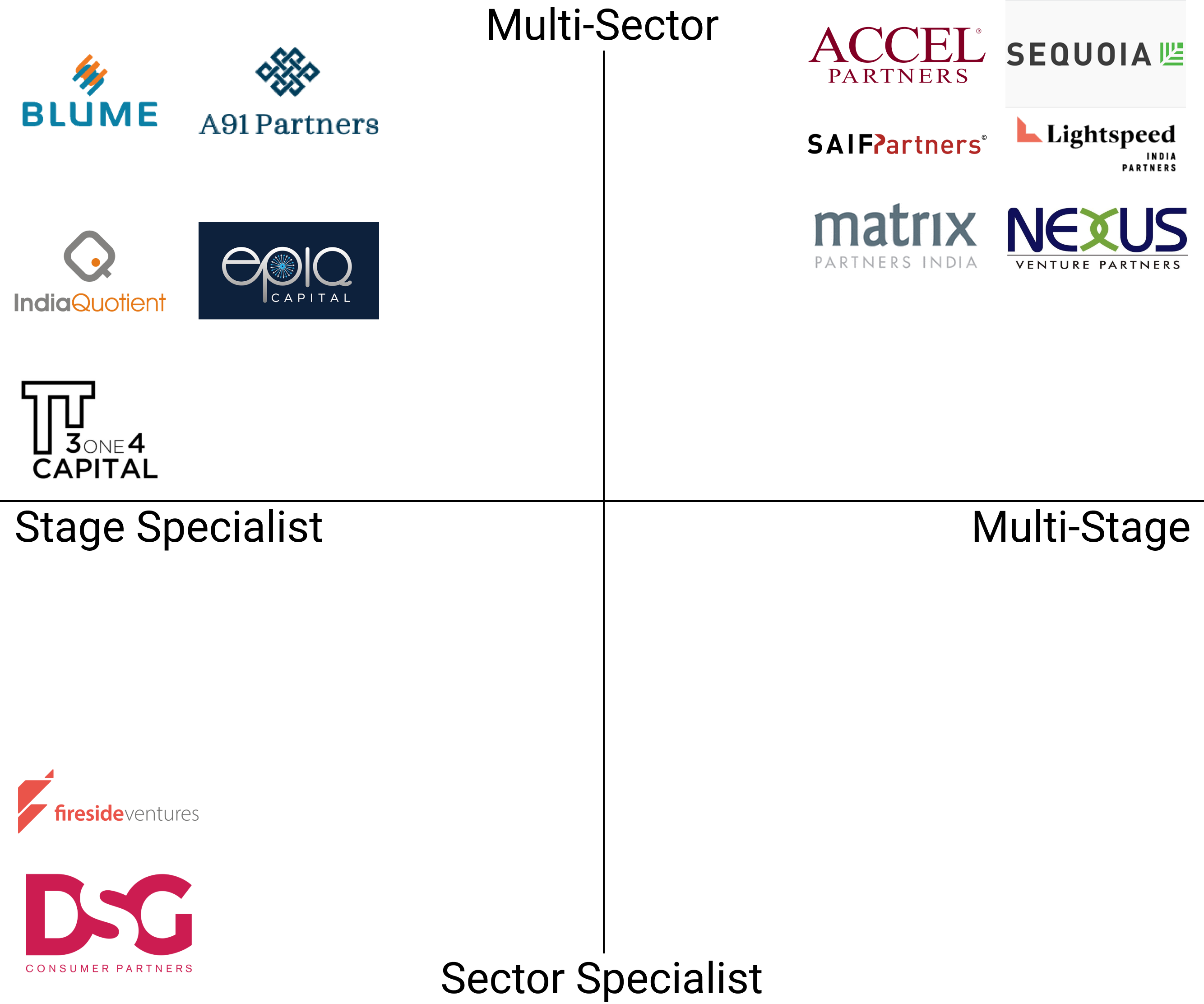 Stage: Blume Ventures, India Quotient & 3one4 Capital largely focus on the early stages (pre-seed, seed & post-seed). And A91 Partners & Epiq Capital on the later stages (both funds are fairly new)